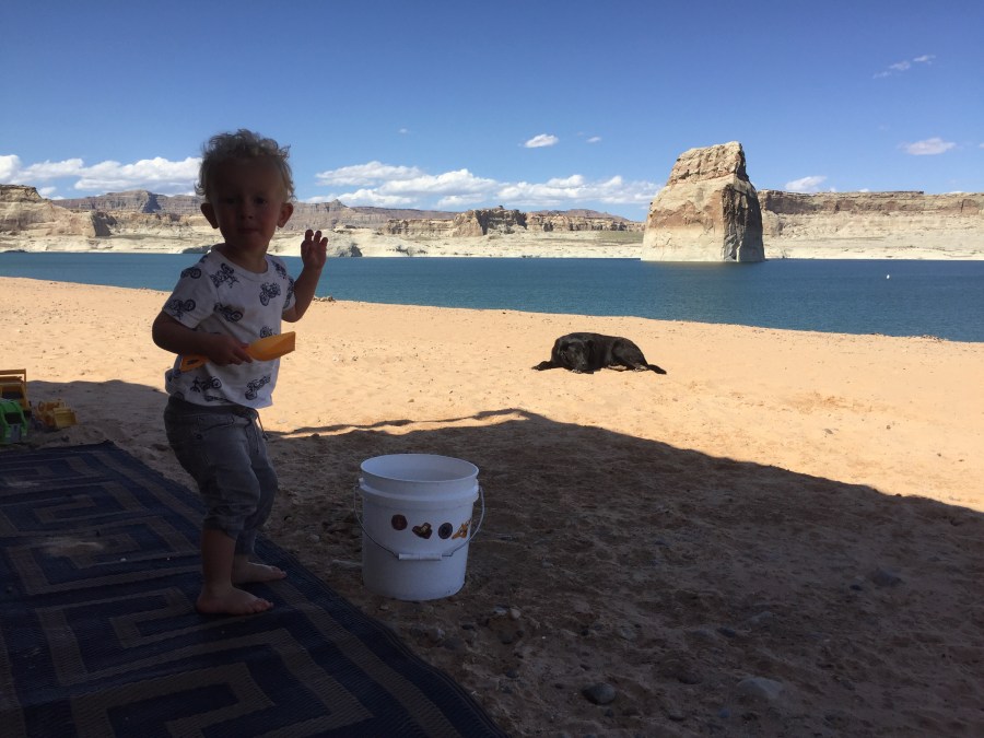 Arrived at the Lone Rock Campground. It was awesome in that you drove (rig and all) onto the beach and camped by Lake Powel. We were very excited to be there until talking with some neighbors who felt with wind the prior day. They said it was horrible and the next day was supposed to be windier. Many people were leaving to a campground a mile or so down the road. At this point we (I) was over the wind and did not want to get the camper and us sandblasted just to camp on the beach. We checked out the campground/resort nearby and moved there for the next few nights.